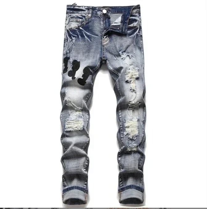 AMIRI new foreign trade style fashion blue ripped patch embroidery elastic mid-waist slim-fit men's jeans (5 styles)-2432