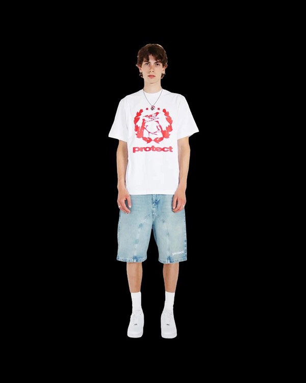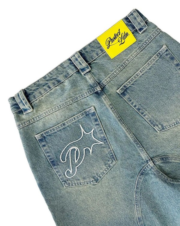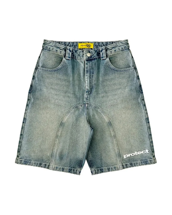 Protect Embroidered Loose Harajuku Washed Denim Shorts-4926