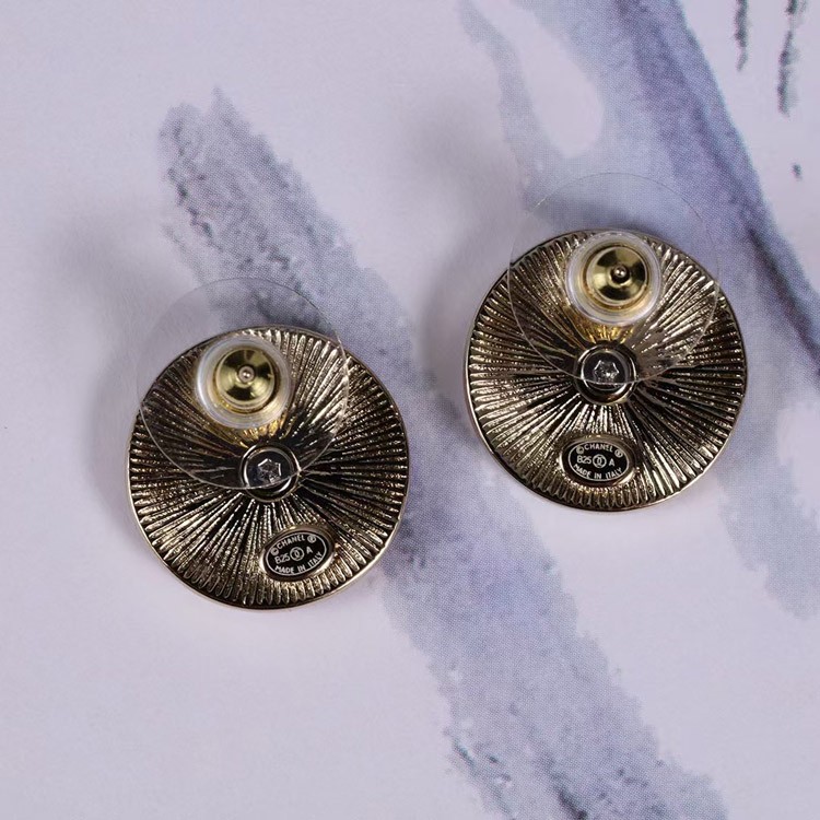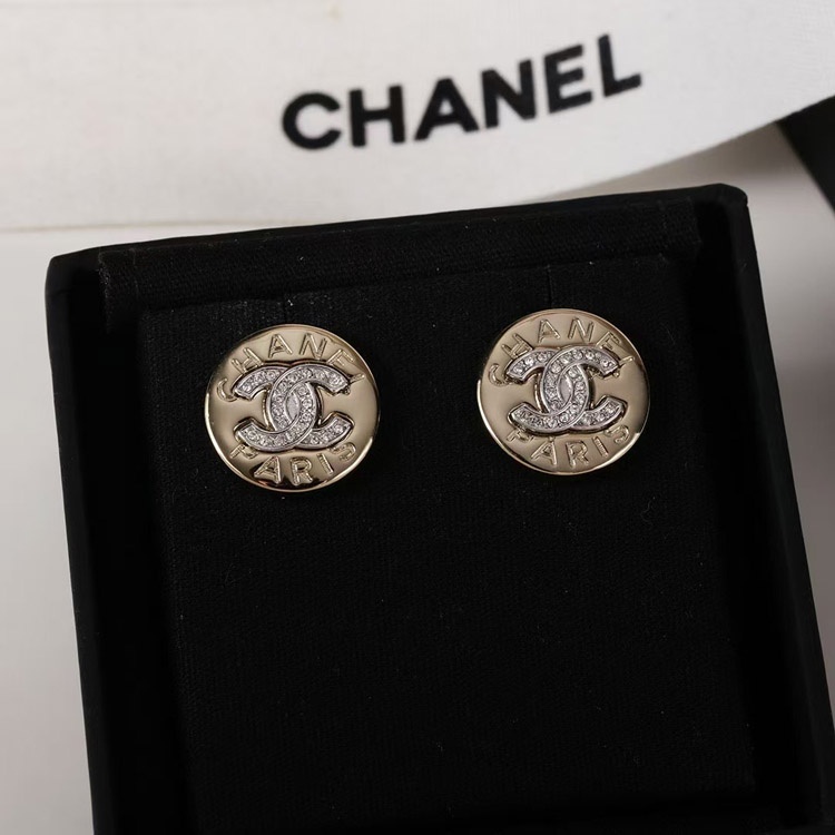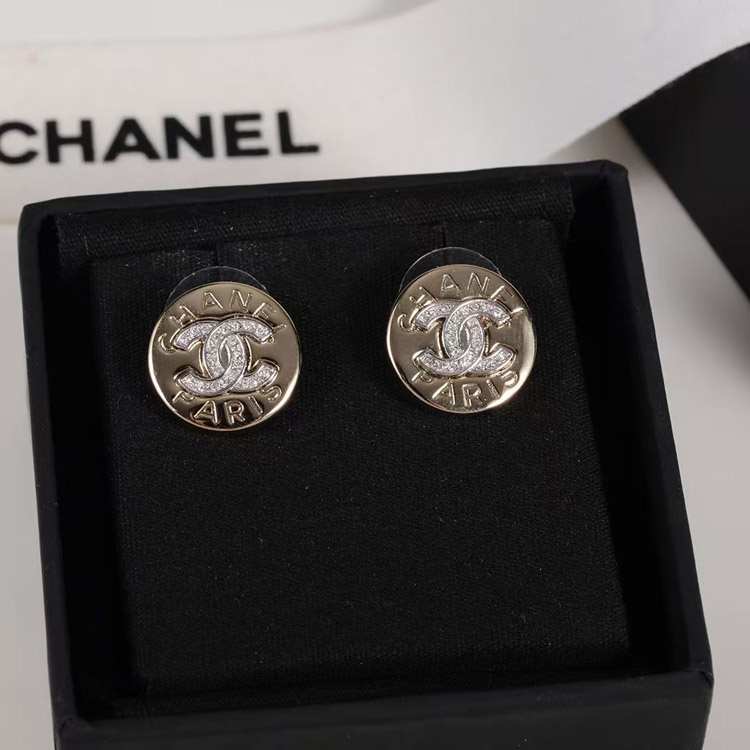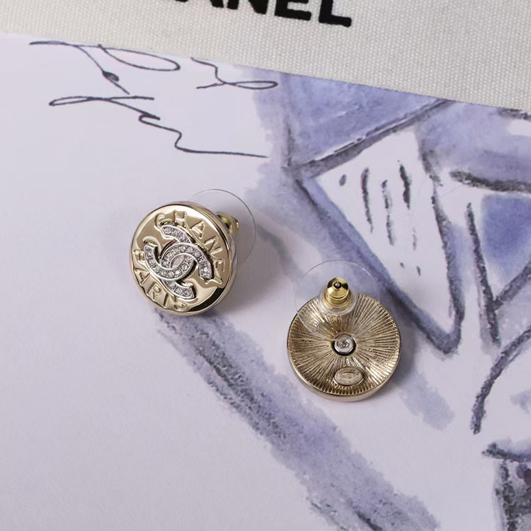 Chanel gold round double c rhinestone letter gold coin earrings-3741